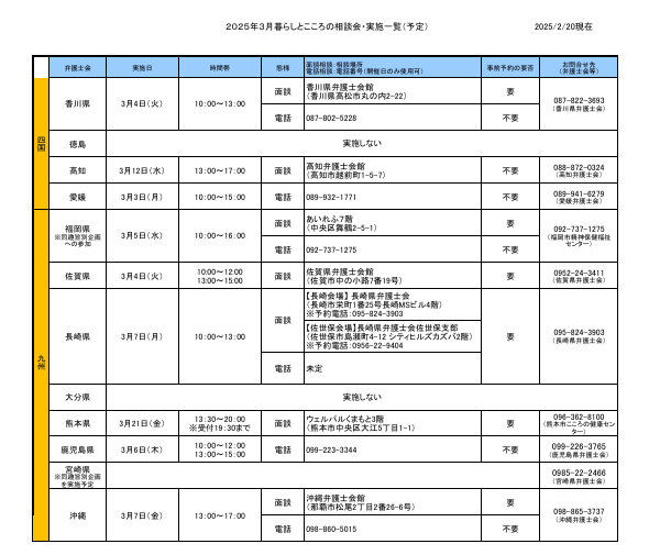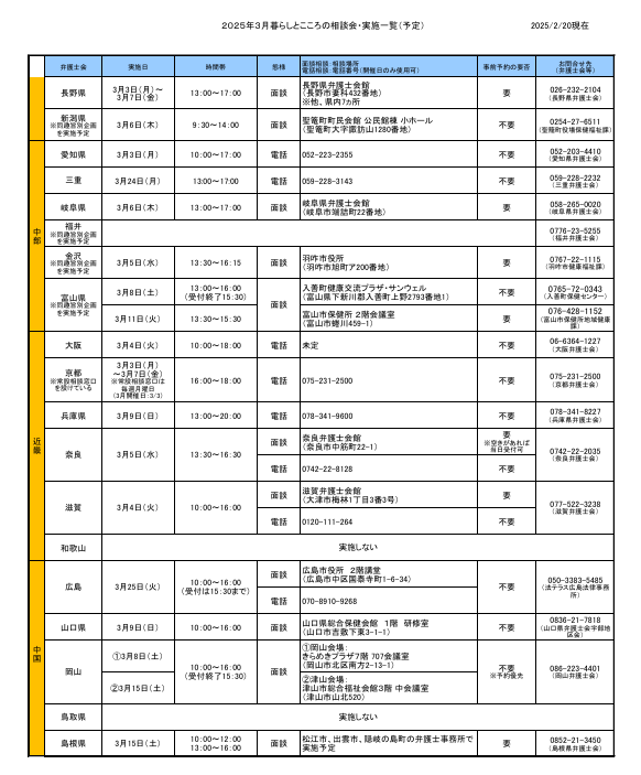 各地の実施内容や面談の予約方法などにつきましては、「実施予定一覧」をご参照の上、各弁護士会にお問い合わせください。