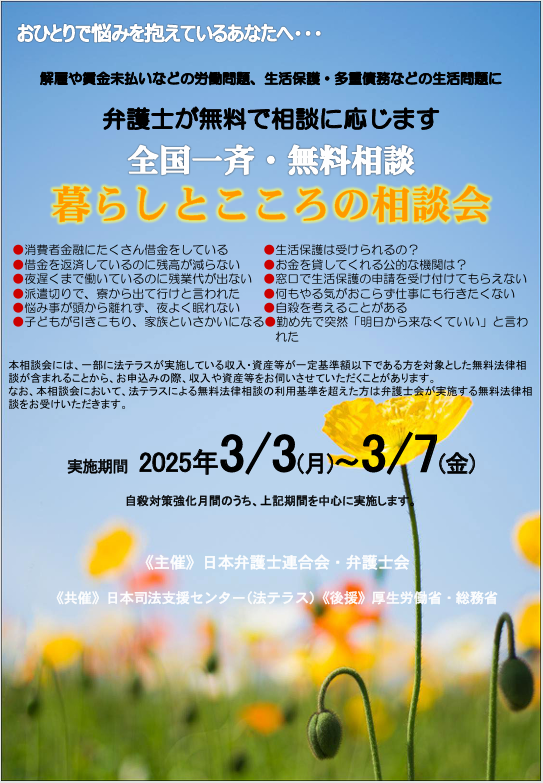 そこで、政府が定める3月の「自殺対策強化月間」に合わせ、日本弁護士連合会・各弁護士会・日本司法支援センター(法テラス)の共催により、解雇や賃金未払いなどの労働問題、生活保護、公的貸付、多重債務などの生活問題、離婚や親子の問題などの家族の問題、それらを原因とするこころの問題などに、各地で弁護士が無料で相談に応じます。