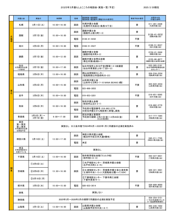 各地の弁護士会において、2025年3月3日(月)から7日(金)を中心とした日程で、相談会を実施いたします。お気軽にご相談ください。
