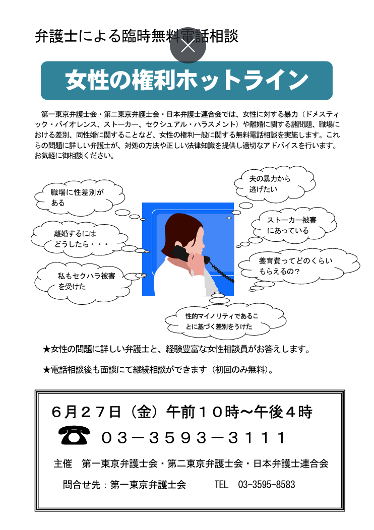 第一東京弁護士会・第二東京弁護士会・日本弁護士連合会では、女性の問題に詳しい弁護士と経験豊富な女性相談員による無料相談を実施します。