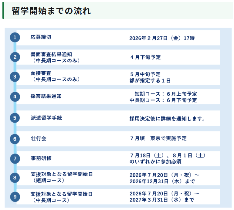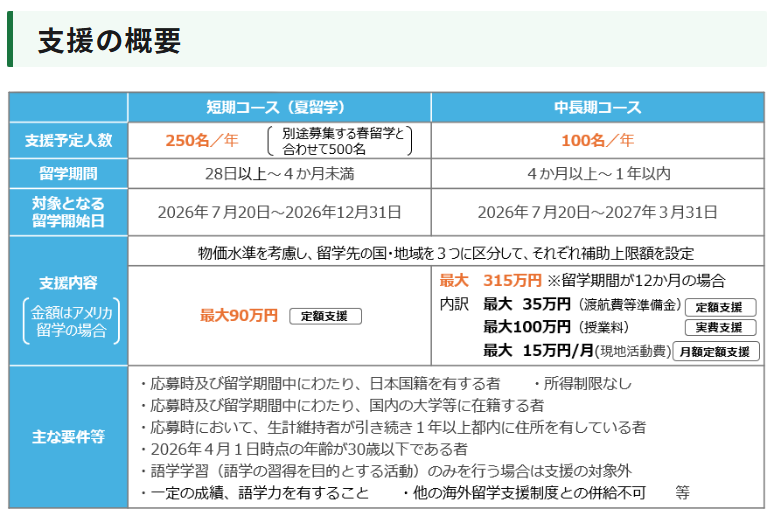 2026年度の短期コース(夏留学)及び中長期コースの派遣留学生の募集に関する応募方法、支援内容等を定めております。主な応募要件は以下のとおりです。