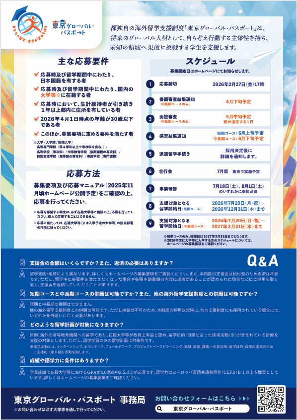 東京グローバル・パスポート募集要項(令和8年度(2026年度)短期コース(夏留学)及び中長期コース)