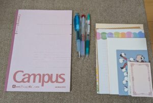 (ボールペン(黒、緑)、3色ボールペン、ノートA4、便箋(