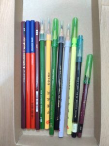 長形40号封筒(開封して数枚使用しています)20枚、鉛筆(HB5本、2B1本、3B1本、4B1本、5B1本、黒色鉛筆1本)、消しゴム2個