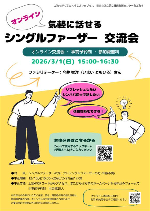 3/1(日) 気軽に話せる シングルファーザー交流会<オンライン> | 世田谷区立男女共同参画センターらぷらす