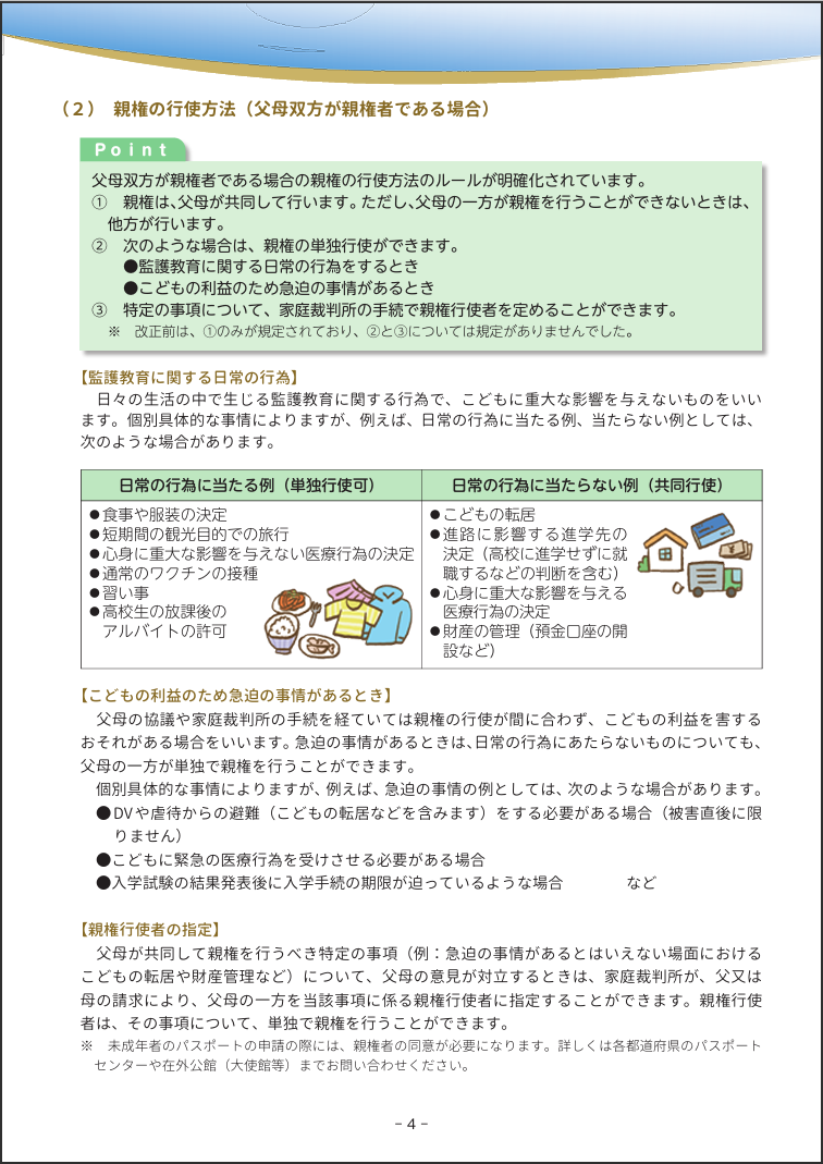 共同親権となった場合、親権は原則として父母が共同して行いますが、スムーズな子育てのため、以下のような例外が認められます。