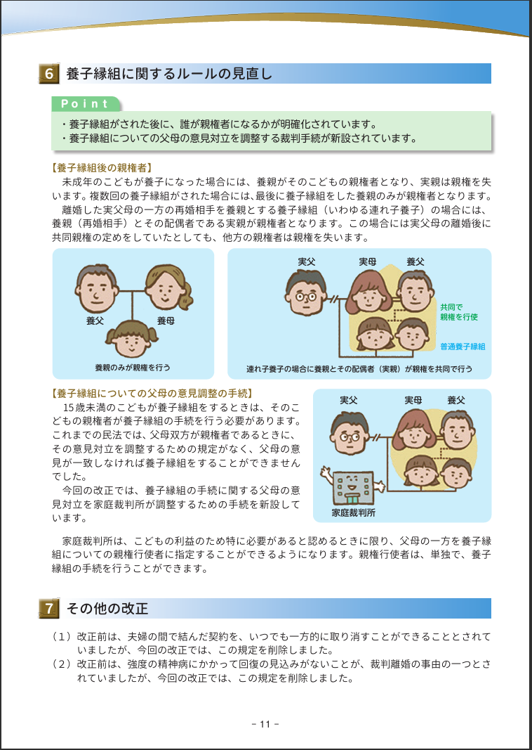 養子縁組がされた後に、誰が親権者になるかが明確化されています。また、養子縁組についての父母の意見対立を家庭裁判所がその話し合いを調整できる新しい仕組みが作られました。