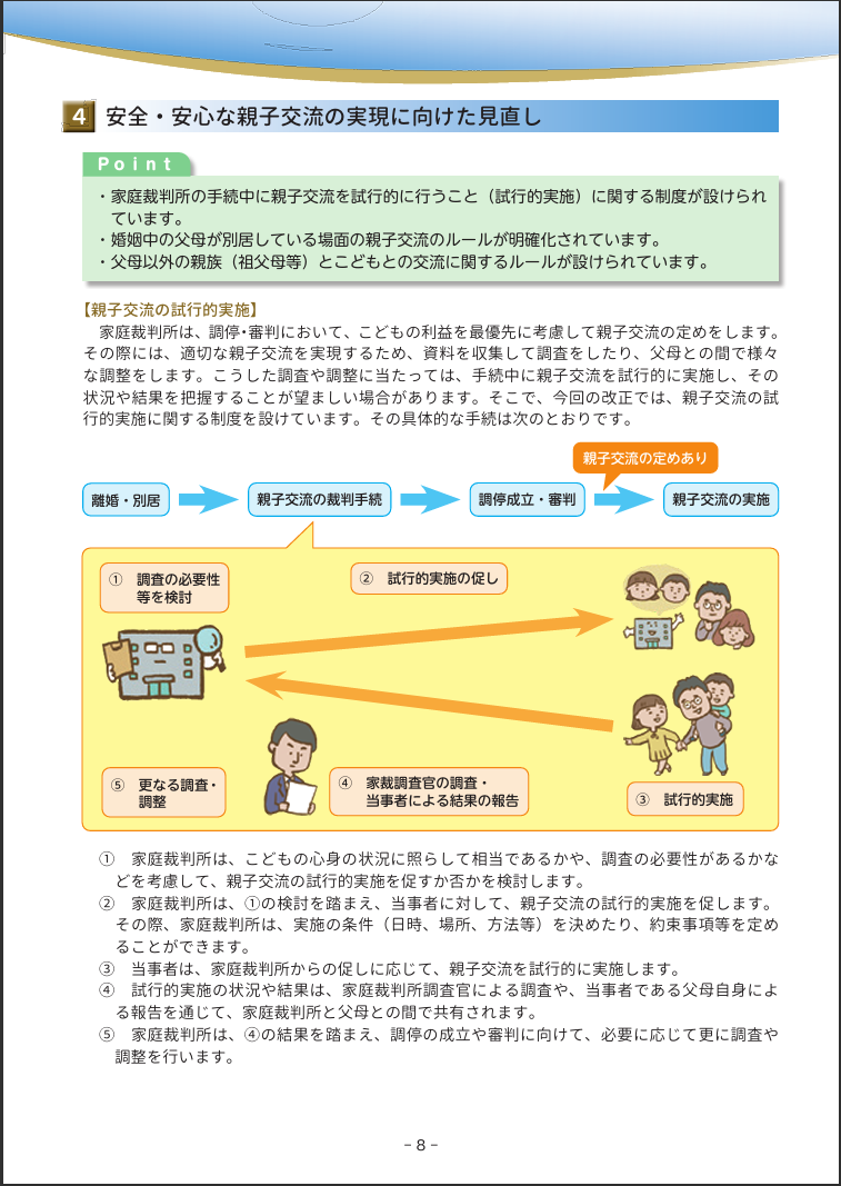 裁判で話し合いをしている途中でも、親とこどもが実際に会ってみる「お試しの親子交流」をできる仕組みが作られました。